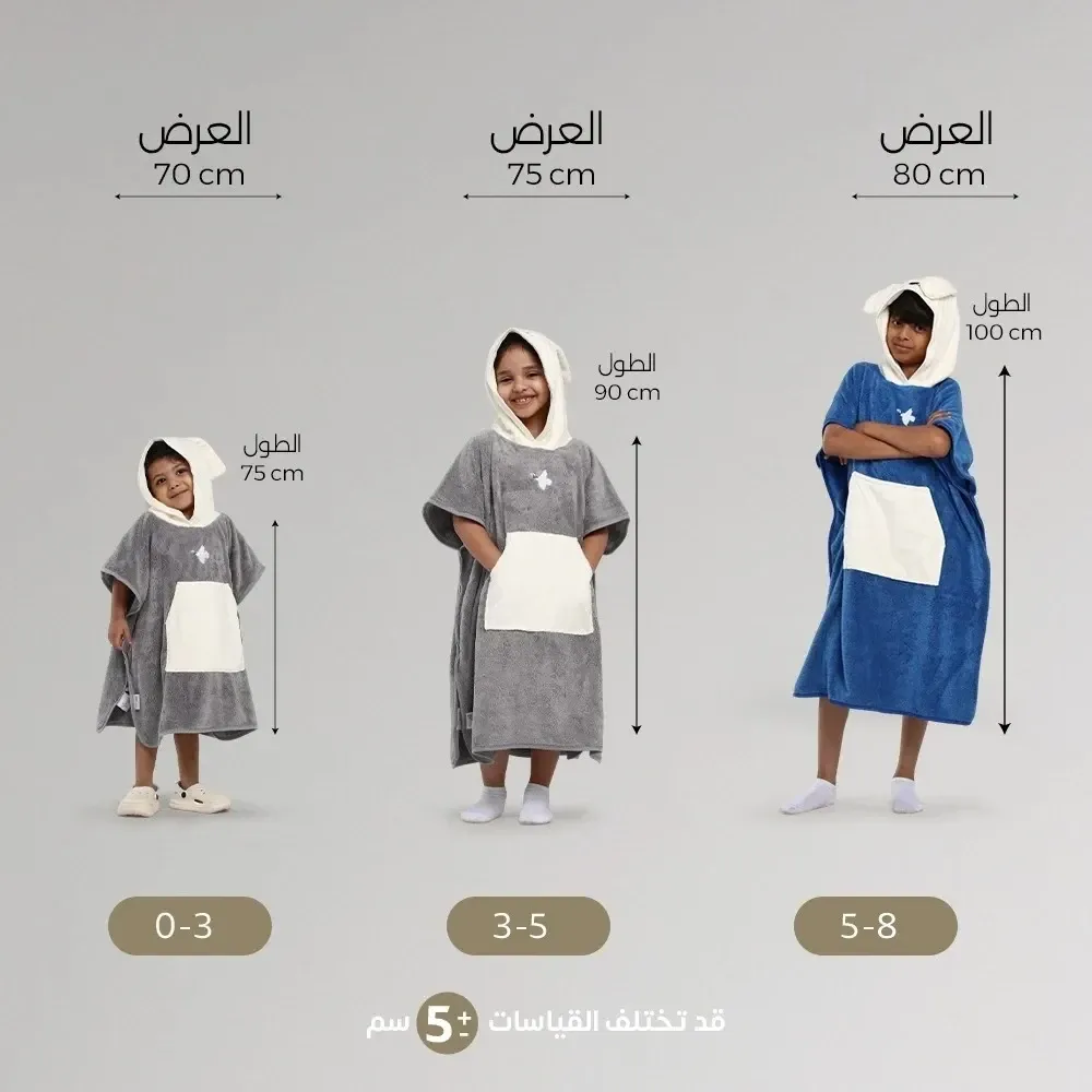 • التصميم: كابا مع قبعة مدمجة لتجفيف الرأس بسهولة وحماية الشعر.